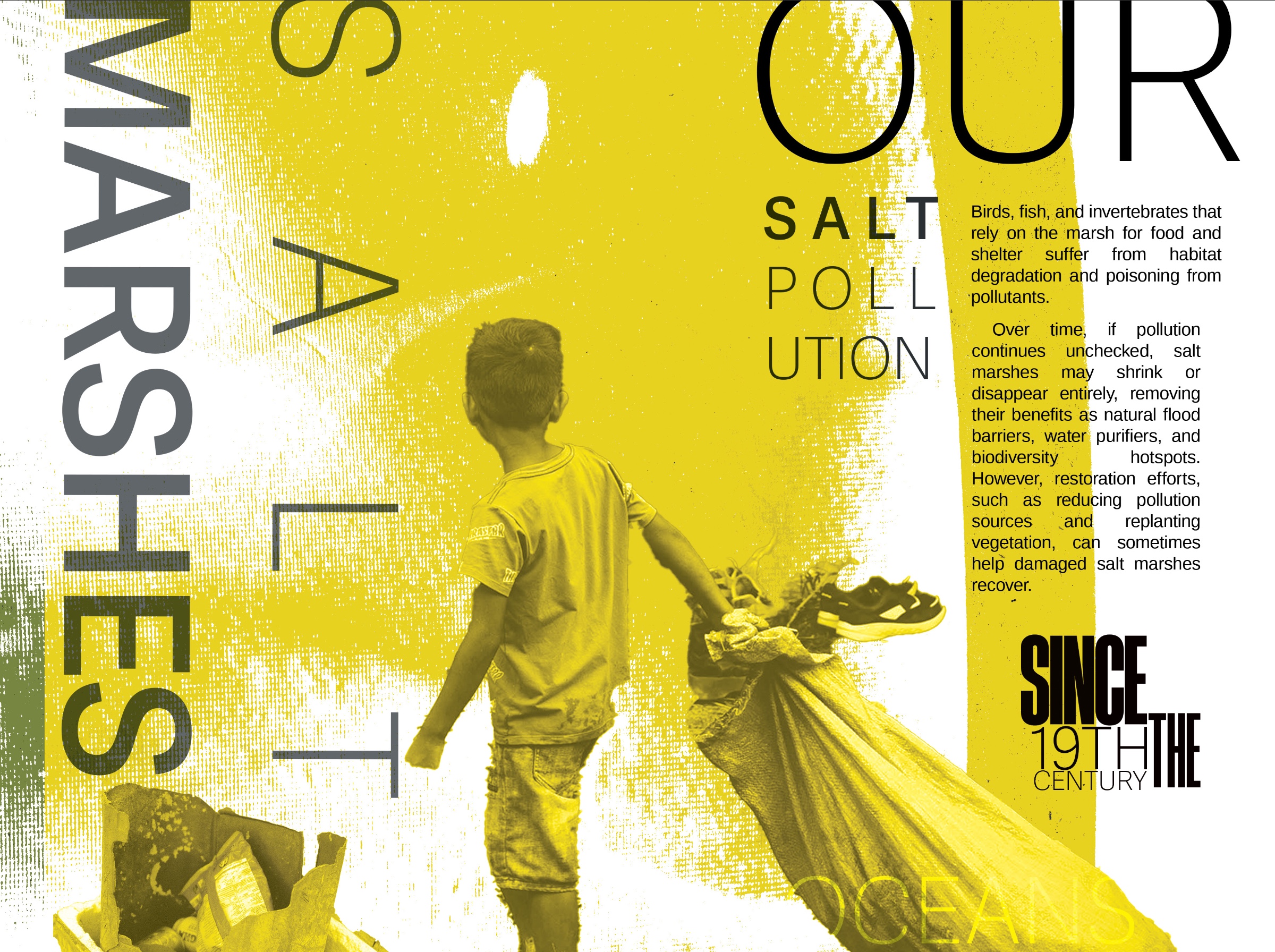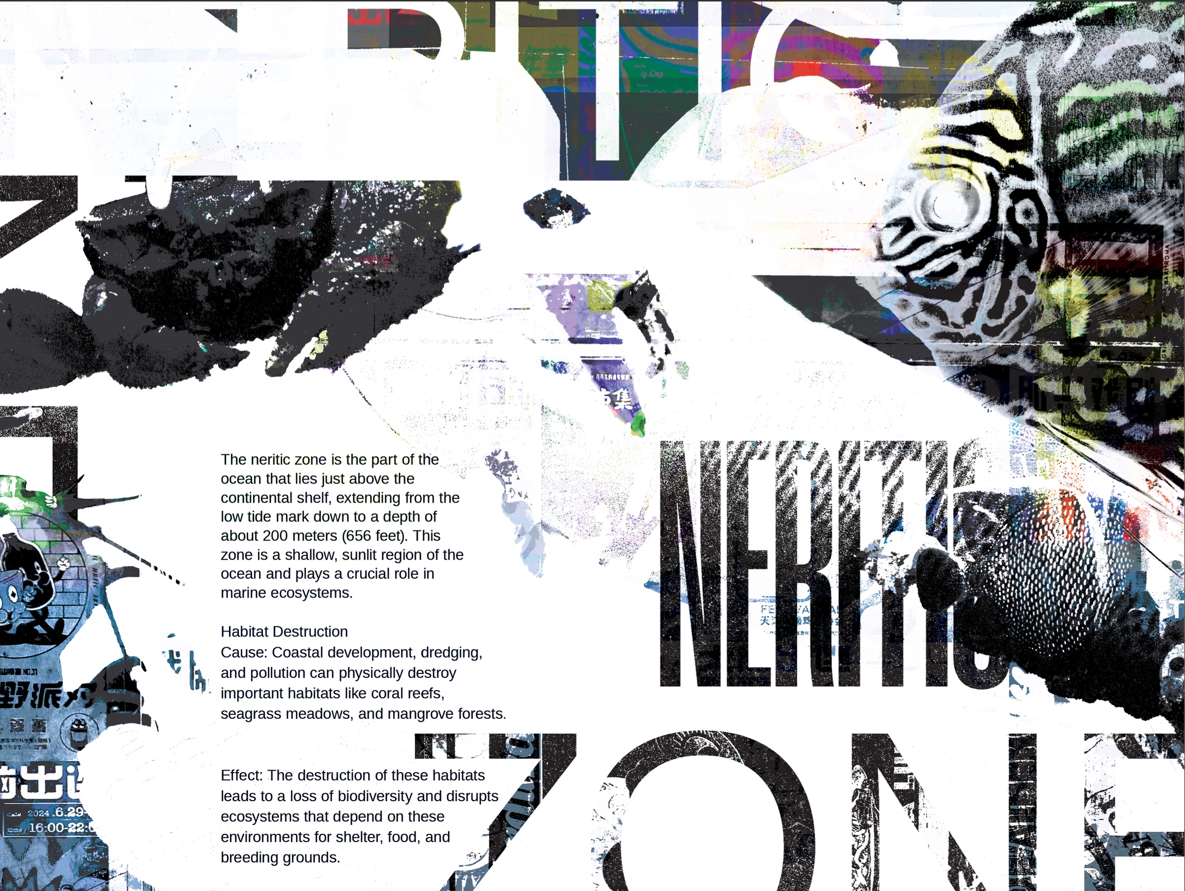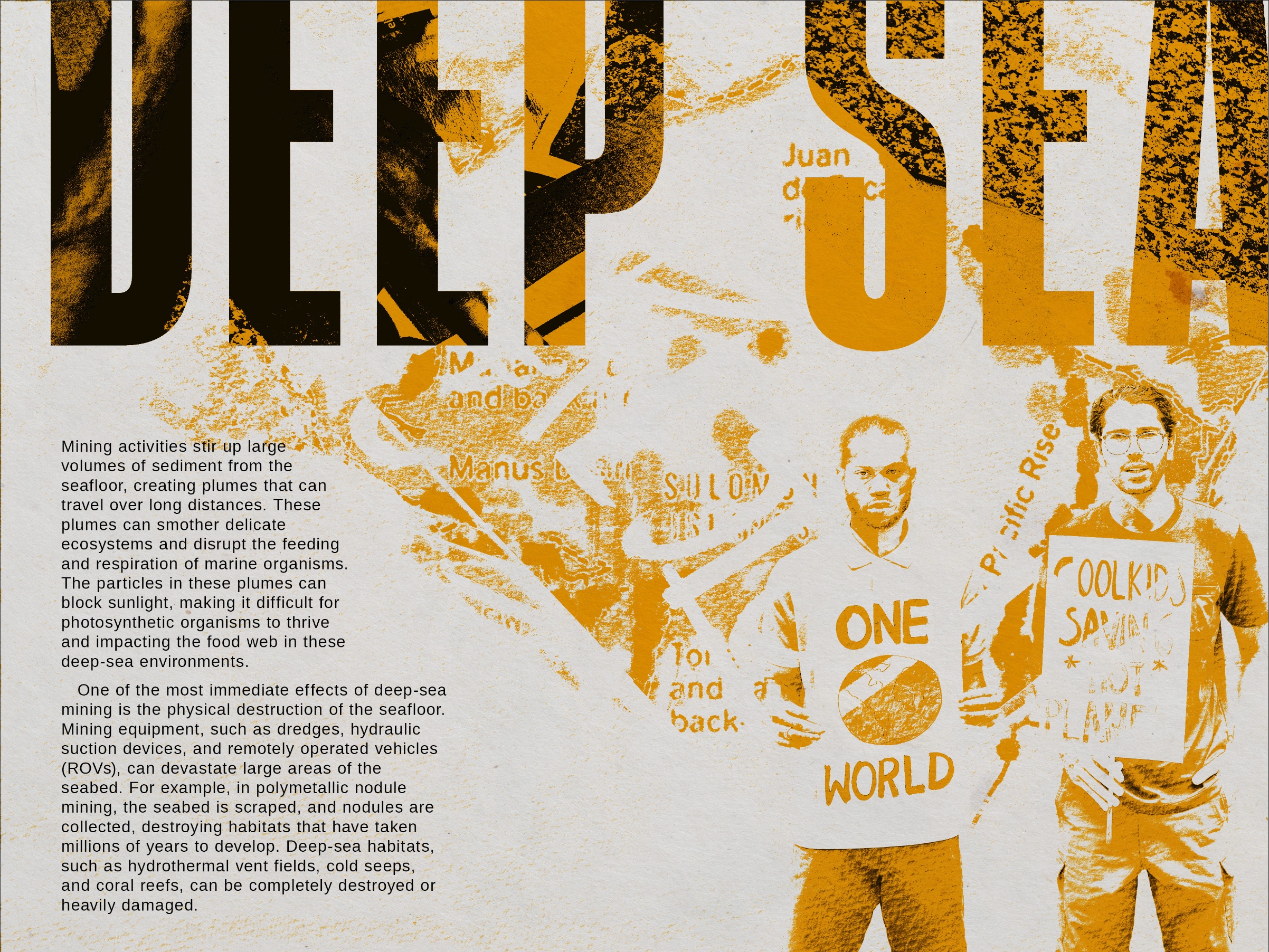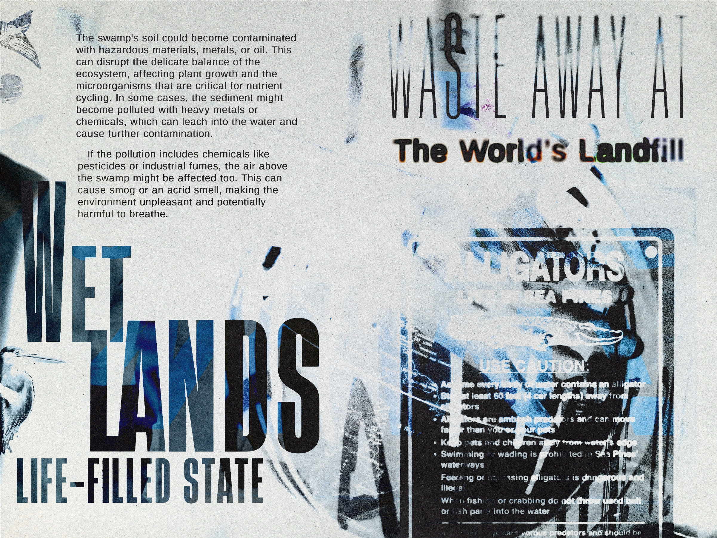 My design process begins with obtaining research to determine the color palette and resources required for overlaying imagery. For example, I collect color samples from vanished environments and use desaturated pigments to contrast with the vibrancy of a thriving past. I then combine this with handpicked photos and text to create multidimensional graphics that express what is happening.