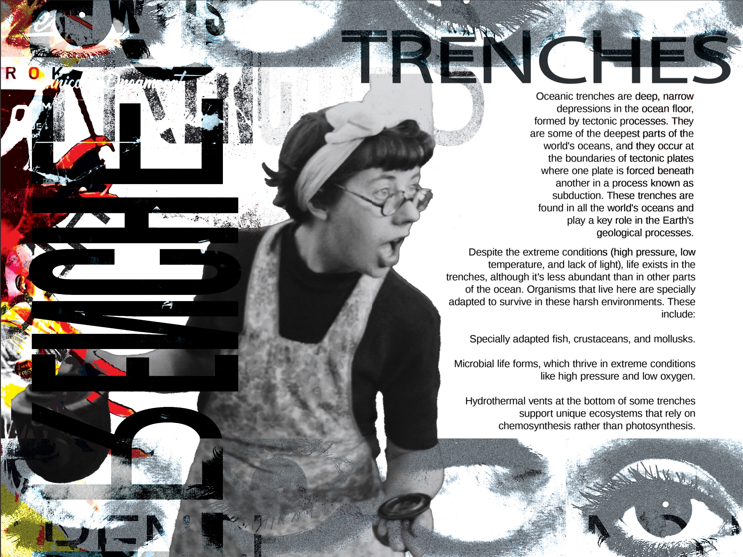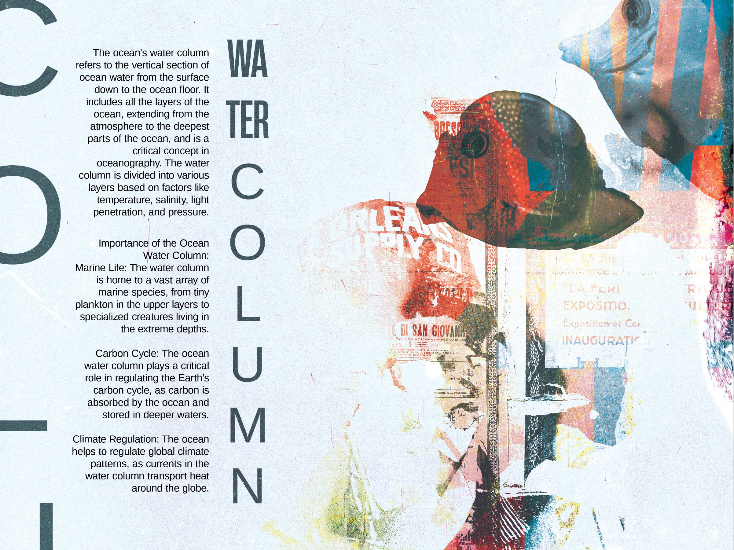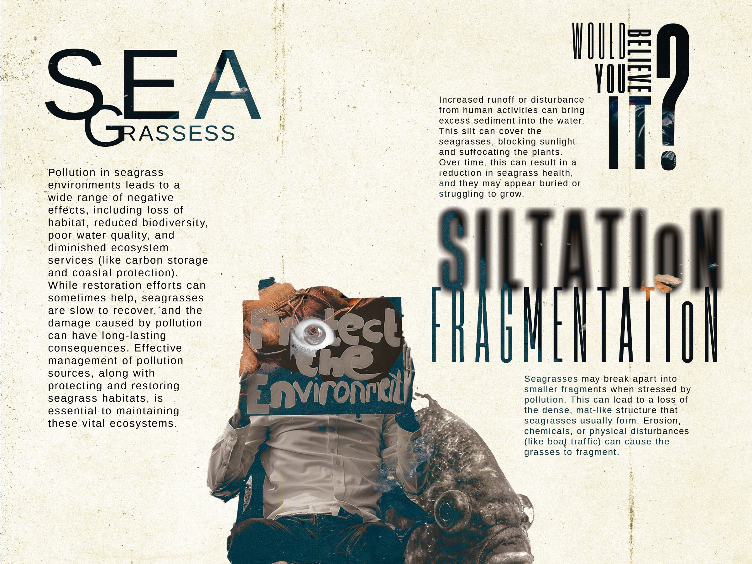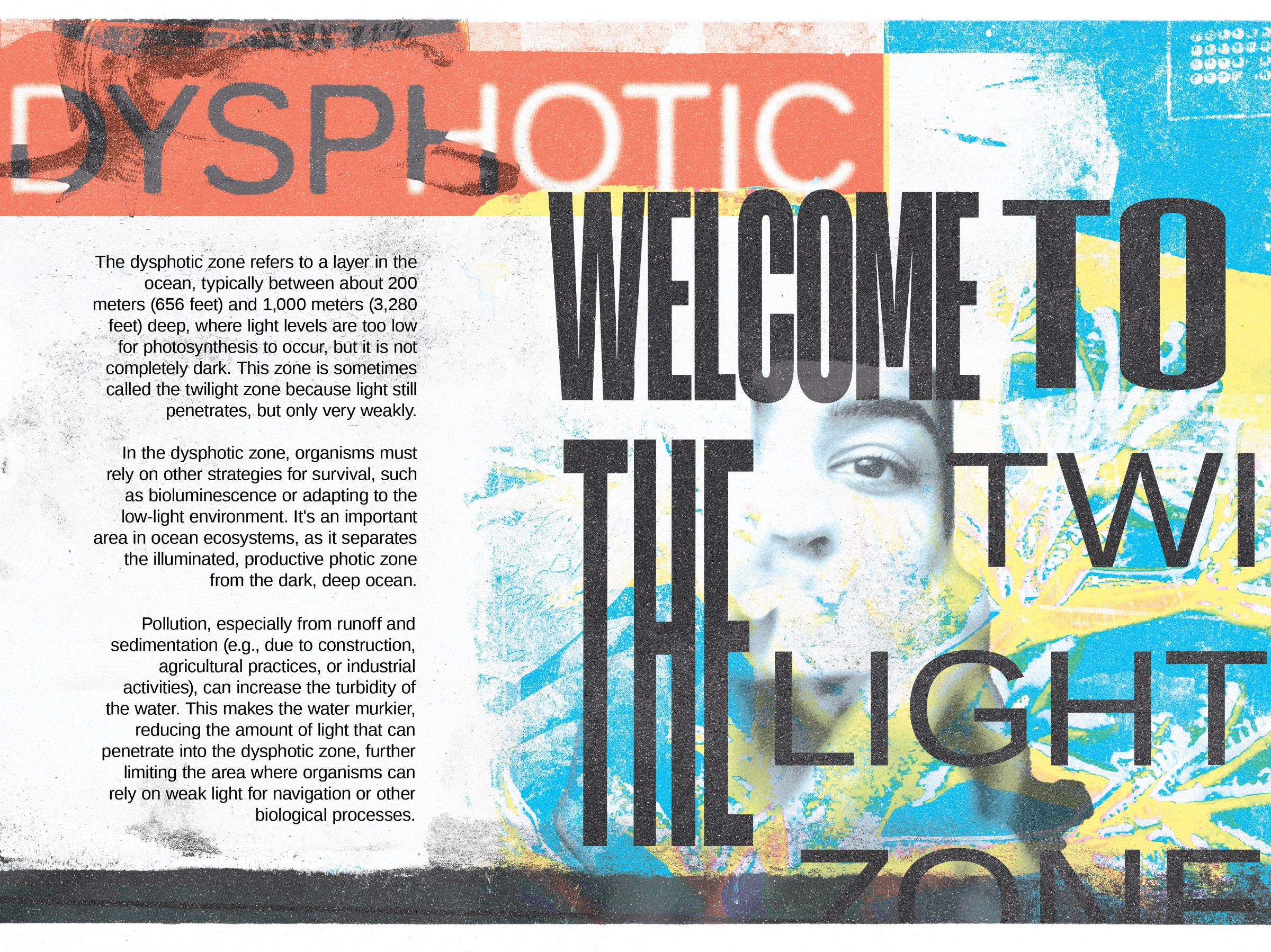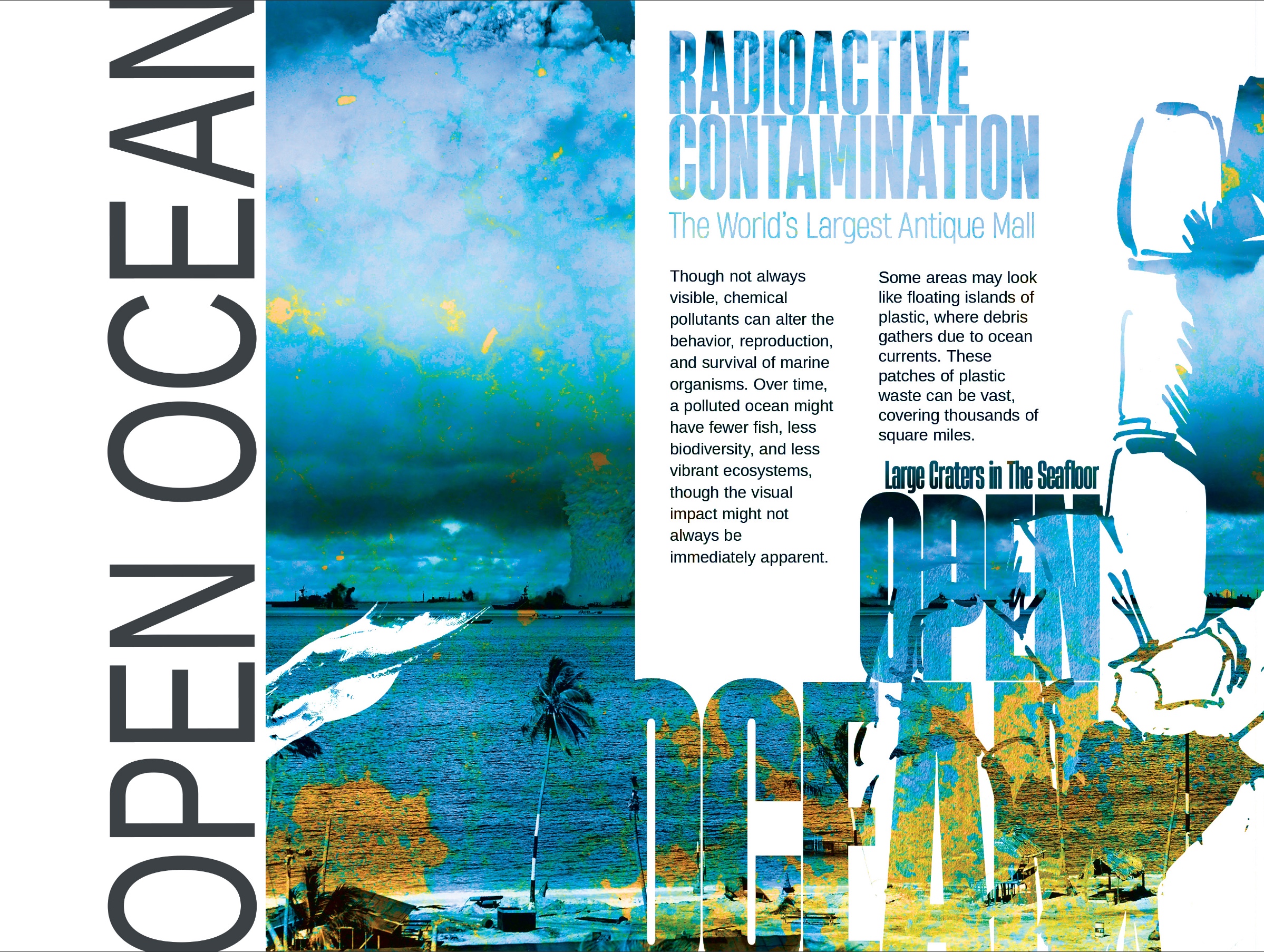 My design process begins with obtaining research to determine the color palette and resources required for overlaying imagery. For example, I collect color samples from vanished environments and use desaturated pigments to contrast with the vibrancy of a thriving past. I then combine this with handpicked photos and text to create multidimensional graphics that express what is happening.